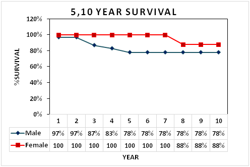 According to our extracted data from SPSS and other software, the 5-year and 10-year survival in male and female is presented in below Figure 1.