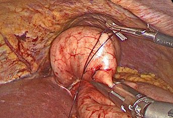 Once the trocars are placed, we examine the entire peritoneal cavity in search of lesions that have gone unnoticed by imaging studies. We proceed to the instrumental palpation of the gastric lesion which is identified in the anterior cardia (Figure 3).