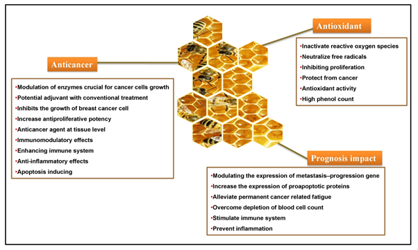 Discussion: Several studies unveiled the outstanding potential of honey to modulate apoptosis, immune response, and inflammation processes. Its healing powers could also be explained by its antioxidant potency and preventive effects against oxidative stress which often causes cancers. Similarly, its remarkable prognosis effects on breast cancer patients have been widely debated. Honey does not only improve the life quality of patients undergoing chemotherapy by reducing its side effects but also increases their survival rates.