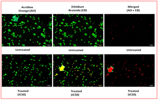 Figure 2 Determination of apoptosis inducing using fluorescent microscopy employing double staining method of MCF-7 Cells Treated with IC50 of Acacia honey, compared to untreated cells used as control.13 (Note: Viable cells: green color (green arrow); Early apoptotic cells: yellow color (yellow arrow); Necrotic cells: red color (red arrow). Magnification: 100x).