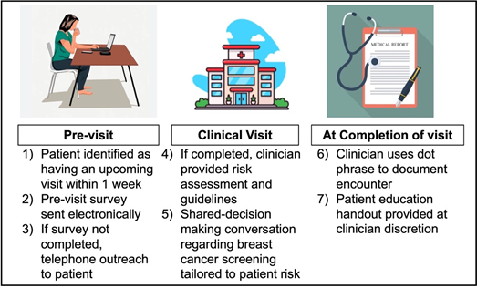 Methods: A single-arm interventional study was conducted in an academic primary care clinic for women 25-50 years old presenting for primary care appointments. Pre-visit workflows evaluated breast cancer risk using the Cancer Risk Assessment (CRA) Tool and information was provided to the clinician with guideline-based recommendations. Post-visit questionnaires and chart review were conducted.