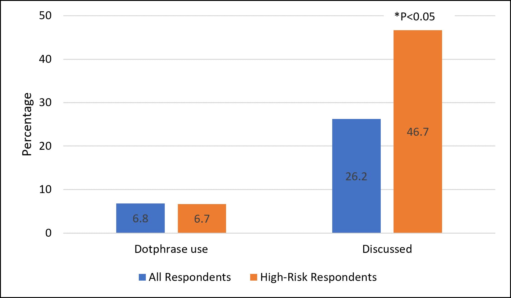 Figure 2 Documentation of risk discussion in women completing breast cancer risk assessment. Although dot phrase use was limited, in 26% of encounter, clinicians documented risk assessment discussion in 26% in a higher percentage of encounters in women identified as having an increased risk of breast cancer than average risk individuals.