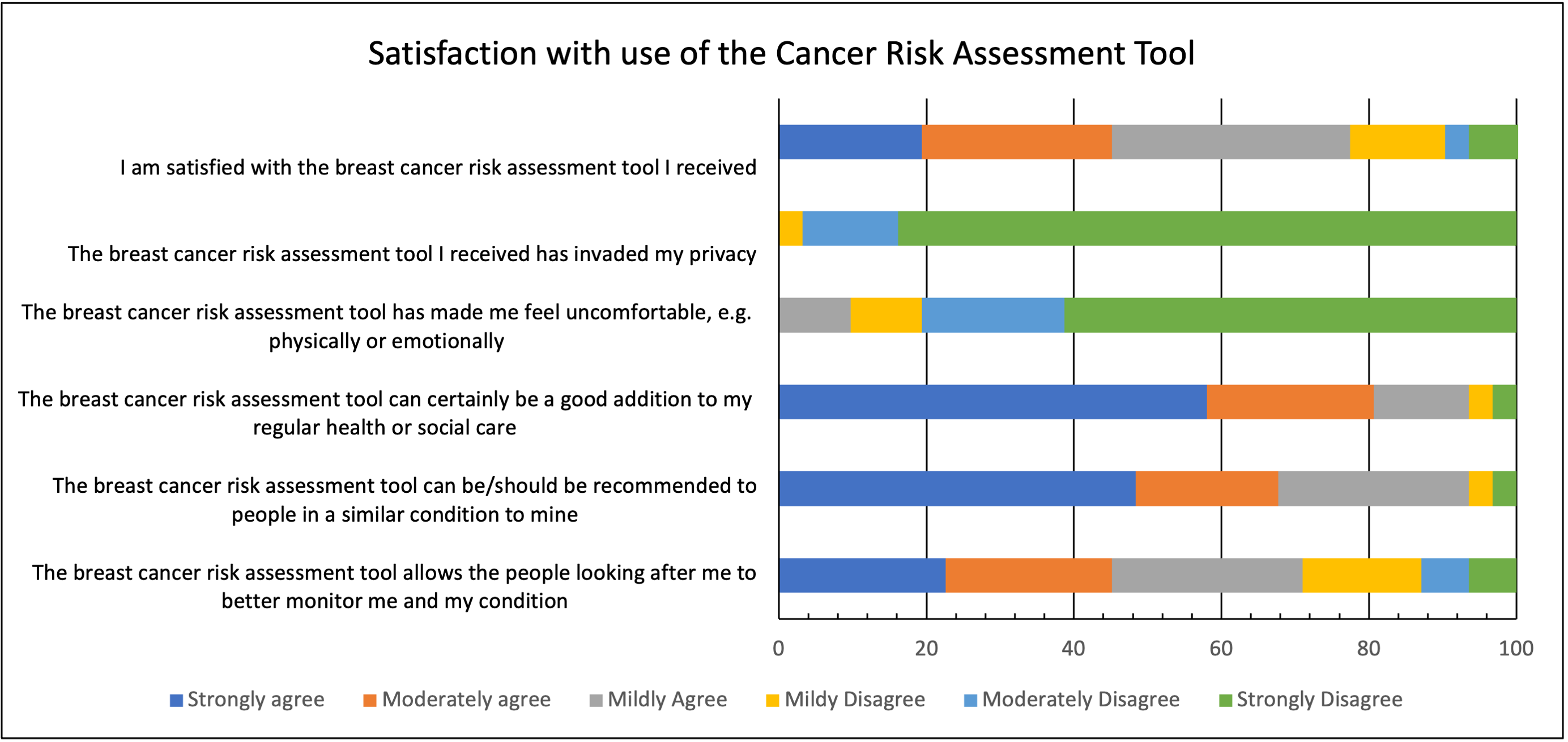 Participants overall reported satisfaction with the process of risk assessment. Additional opportunities for further evaluation of the initial risk assessment survey would be beneficial. Our study expands upon the previous findings; demonstrating 85% of women consider risk assessment to be a good idea. In a pilot implementation phase, the majority of women reported that the breast cancer tool would be a good addition to their regular health care and that after use in and experience in the primary care setting (93.6%). Based on this response, patient feedback supports a broader implementation of risk assessment tools in the primary care population. In addition to acceptability of the screening process, patients reported a good understanding of their breast cancer risk and screening plan. Improvement in the explanation of outreach may be a potential opportunity to improve the questionnaire response rate. This could include expansion of the introduction of the screening process with the survey, patient messaging within the EHR providing education about the screening, and further integration within the electronic health record to improve capacity for patients to interact with the clinical team.