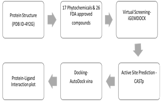 The interactions like Hydrogen Bonding and other non-bonded terms between the top docked Phytochemicals, Commercial drug and the receptor are seen using Accelrys Discovery Studio Visualizer software 25. Figure 1 shows the methodology.