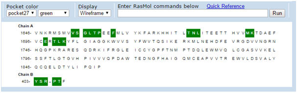 Figure 3 Shaded Regions representing active site residues using CASTp. Various residues from both the chains-A,B are involved. These residues are further mapped onto the structure to know where exactly the active site is present in the molecule.
