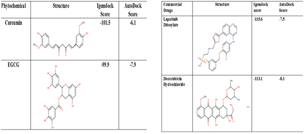 Molecular Docking was done taking these top five small molecules from both phytohemicals and commercial drugs and further the molecules were docked to the active site of the protein. Various binding affinities are obtained for all the ligands in terms of (Kcal/mol). The various features and the binding affinities of the docked complexes of are summarized in Table 3, which shows the summary of Top five Phytochemicals and Commercial Drugs binding affinity scores obatined from AutoDockvina interms of kcal/mol. The highly negative energy score represents the stronger binding affinity between the receptor whereas EGCG (green tea extract) and Doxorubicin Hydrochloride attained the highest binding affinities from the top five screened compounds. Table 4 shows the chemical structure of the top 2 Phytochemicals and Commercial Drugs Binding Afiinity scores obatined from iGEMDOCK and AutoDockvina.