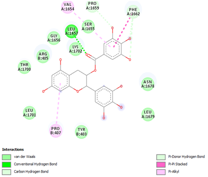 Figure 5 shows BRCA1 Protein and EGCG Receptor interaction plot viusalised using Discovery studio viusalizer. It represents various residues corresponding to different types of interactions of BRCA1 with EGCG. A conventional hydrogen bond is seen between Leucine:1657 (A-chain) of BRCA1 and the EGCG molecule and other non-bonded interacting residues can be seen.
