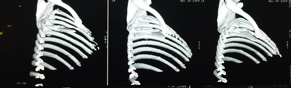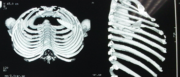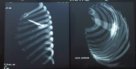 Sharp objects of any material are very frequently involved in traumatic injuries caused by car accidents, due to the high plastic component that cars currently make up. Wounds caused by reflective glass (mirrors) are more frequently found in accidents that occur at home and are characterized by small punctures or large linear wounds with section of skin, muscles, tendons and/or blood vessels in the lower or upper limbs. The anatomical characteristic of the rib cage allows the development of a relatively thick fatty tissue, depending on the build of the person, which in turn covers the different muscles of the anterior and posterior region of the thorax. The possibility of lodging foreign elements between the muscle mass of the thoracic area or between the skin and the muscle mass is widely proven with the placement of breast prostheses in their different anatomical situations. These "foreign" elements can remain in their position without causing any discomfort for many years; this is because they are malleable or soft.1–3 A different situation occurs when the foreign element is not malleable or soft, and is located in a muscular “neo-compartment” that, when moving, could cause local injuries, pain, or even infectious complications. In the context of an accident involving soft tissue injuries with fragmented material, the complete removal of the same must be ensured when making surgical repairs. Sometimes, the wounds are deep but the hole in the skin is relatively small. When this characteristic is present, the complete removal of foreign material from the depth of the wound must be ensured.4,5