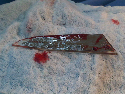 Sharp cutting injuries caused by fragments of broken glass must be thoroughly explored, due to the possibility of leaving foreign elements inside the wounds, which due to the elasticity of the skin, could reduce the size of the wounds, hiding larger fragments underneath within the soft tissues. The speed with which the beveled mirror fragment was introduced, and the closure of the posterior path due to the elasticity of the tissues, prevented the occurrence of pneumothorax.