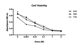 Cell viability analysis carried out by MTT (Thiazolyl Blue Tetrazolium Bromide) assay. For this purpose, approximately 104 cells added to 100μl culture medium and incubated in 96 well-plate at 37°C in 5% CO2. The cells treated with 100μl of the medium that contains various concentrations of acrylamide for 24, 48 and 72 h. Then, 10μl 12mM Thiazolyl Blue Tetrazolium Bromide (MTT; Sigma Aldrich®M2128) solution added to each well and incubated for 4h. Absorbance was measured at 490 nm wavelength in the microplate reader (Biotek, USA).