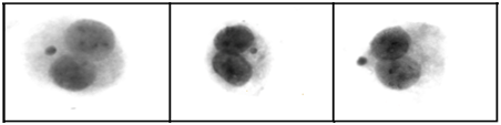 The preparations were examined using appropriate filters on a Nikon ECLIPSE E 600 fluorescence microscope. Nuclei containing FISH signals were analyzed and photographed.