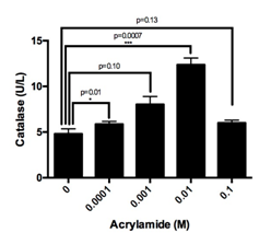 H2O2, which is increased in the cell by SOD, is firstly trapped by GSH and CAT, while GSH is converted into the oxidant form, CAT turns H2O2 into the water by one reaction. When different doses of acrylamide were administered, the amount of CAT increased due to the dose but decreased from the IC50 dose (Figure 6). This decline is due to the same steps as GSH.