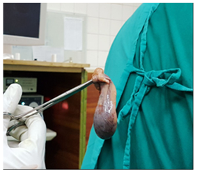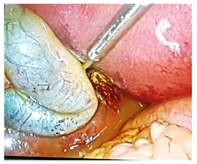 Laparoscopic procedure was carried out under general anesthesia and a small incision is made around the belly button to insert camera. Two more incisions were made nearby to insert other instruments. To separate cavity carbon dioxide gas was used. Arties were clipped with titanium to block the arteries taking blood towards organ that we want to remove like gall bladder and it is taken out through umbilical port (Figure 2). This all procedure took 45minutes in average and patients were sent to recovery room for 15 minutes, later shifted to ward and discharged after one day.