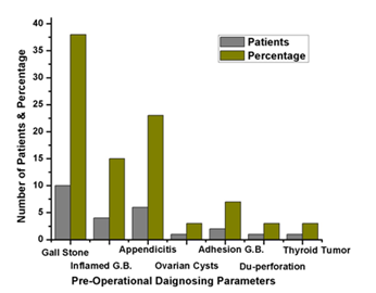 Results: Among all patients the illnesses presented by different patients were vomiting (53.8%), pain in RHC (57.6%), (pain in RIF (Right iliac fossa) (11.5%) and pain in abdomen (15%). Pre-operational diagnosis included gall stone (38%), inflamed gall bladder (15%), appendicitis (23%), multiple ovarian cysts (3%), du- perforation (3%) and thyroid tumor and narrowing trachea (3%). In laparoscopic surgery, treatments gall bladder was removed from all the patients having gall bladder diseases. Appendicitis and tumor were also removed, ovarian cysts de-rooted and omentoplasty done for du-perforation patients.