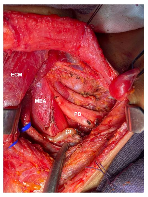 (ECM); Sternocleidomastoid muscle, loaded with vessel loop moved medially. (MEA); anterior scalene muscle.