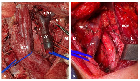 Figure 5 Carotid region right side view (A) and left side view (B): Yugular vein load (VY), lateral retraction of the sternocleidomastoid muscle (SCM), Thyrolinguofacial trunk (TRLF) and hypoglossal nerve (NH).