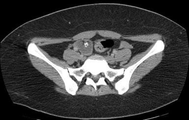 The protocol is complemented with an extension study using an abdominal-pelvic CT scan, documenting a heterogeneous tumor dependent on the right annex with multiple calcifications inside, suggestive of teratoma (Figures 3 and 4).