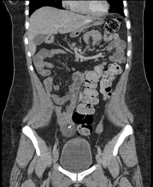 Figure 4 Abdominal and pelvic CT in coronal section showing a heterogeneous tumor dependent on the right ovary with a hyperdense calcium image (393 HU) inside, with peripheral enhancement to the contrast and with dimensions of 3.9 x 3.6 x 4.3 cm and a volume of 30cc.