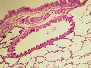 Figure 5 40x photomicrograph. Section stained with Hematoxylin and Eosin; Alveolar structures with simple squamous epithelium and bronchi covered by ciliated columnar epithelium are observed in the context of a Mature Teratoma.