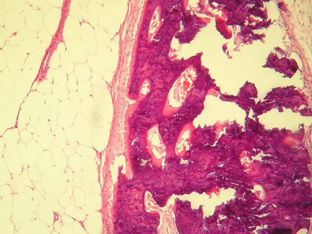 Figure 6 20x photomicrograph. Section stained with Hematoxylin and Eosin; Adipose tissue, fibrous pseudocapsule and osteoid tissue are observed, with bone trabeculae and osteoblasts in the context of a Mature Teratoma.