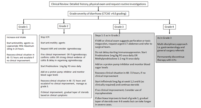A physical exam should include an assessment of haemodynamic stability and a complete clinical exam including abdominal and per-rectal exam. Baseline investigations should include routine bloods tests including haematology and biochemical profile, lactate, cortisol, thyroid function tests, and random serum glucose. Stool examination for ova and parasite as well as clostridium difficile assay should be requested if it is clinically indicated. An abdominal X-ray (AXR) would be helpful as it would provide evidence of perforation, bowel dilatation or bowel wall oedema which thereby suggests the presence of colitis. Endoscopy can be helpful in guiding treatment with early recognition of colitis especially in moderate namely grade 2 toxicity. The findings may include mucosal oedema with biopsies demonstrating neutrophilic, lymphocytic, or mixed neutrophilic-lymphocytic infiltrates.29 Endoscopy may also be helpful in assessing response to immunosuppression namely resolution of inflammatory infiltrate after a period of treatment with corticosteroids. The management of gastrointestinal toxicity involves the use of anti-motility agents and immunosuppression with corticosteroids and it is based on the early identification of severe toxicity (Figure 1).