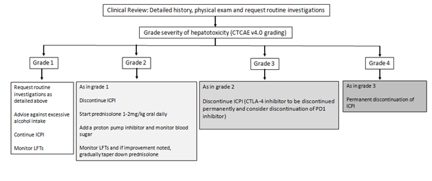 Usually immunosuppression with corticosteroids for 3weeks or more is required with gradual taper in the corticosteroid dose, once severity of toxicity is grade 1 or lower. AST and ALT levels uncommonly do not respond to corticosteroid therapy and in these situations mycophenolate (500mg – 1000mg every 12hours) may be administered in addition to corticosteroids. Antithymocyte globulin (ATG) therapy may also be considered in a refractory setting.32 It is important to remember that Infliximab should not be given to patients with elevated AST/ALT since infliximab carries a risk of hepatotoxicity.