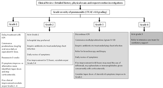 The utility of immunotherapy based treatments is expanding to include a number of tumour groups in view of the potential durable response to treatment. The toxicities secondary to immunotherapy based treatments while generally transient can be on occasion severe and fatal. The management of toxicities revolves around the suspension of treatment with the ICPI and the commencement of systemic immunosuppression. Prednisolone 1-2mg/kg/day (oral), is considered as adequate immunosuppression. This would have to be continued till the toxicities reduce intensity to Grade 1 and then gradually tapered down and discontinued. Patients presenting with Grade 3-4 toxicities secondary to immunotherapy-based treatment will have to have the treatment permanently discontinued. Resuming treatment with the same immune check point inhibitors or switching to an alternative agent should include careful consideration and an in depth discussion with the patient in view of the risk of recurrence of toxicities. If immunosuppression with corticosteroids is unhelpful, the addition of infliximab, mycophenolate or cyclophosphamide may need to be considered. Timely escalation to the primary oncology team and referral to the appropriate sub-speciality (gastroenterology, endocrinology, respiratory or dermatology teams) for clinical advice is encouraged.