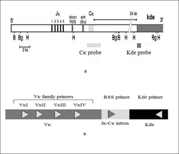 Figure 1 (a) Schematic location of Cκ probe (2.5 kb) and Kde probe (536 pb) for Southern blot analysis. (b) Primers sequences and location for Kde clonal rearrangements PCR analysis.