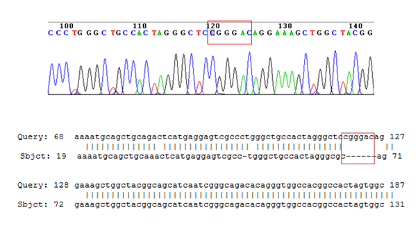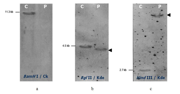 We synthesized Kde probe for optimal detection of IGK rearrangements by Southern blot assay (Figure 1a). We amplified by PCR one fragment with the expected size as it was controlled by 2% agarose electrophoresis of the purified fragments. The sequence of the Kde fragment was verified by direct sequence and blasted in NCBI (locus X03957) (data not shown). The 536 pb fragment is the IGK-Kde probe which is specific to 5’region of Kde segment located downstream of the Cκ. This probe was cloned in the vector pCR®2.1 and confirmed by enzymatic digestion, PCR amplification and direct sequence.