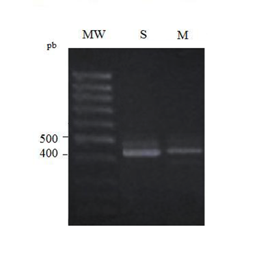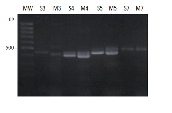 Figure 5 2% Agarose electrophoresis of simple (S) and multiplex (M) PCR IGK-Kde products in B-CLL cases (samples 3, 4, 5, 7) - MW: molecular weight.