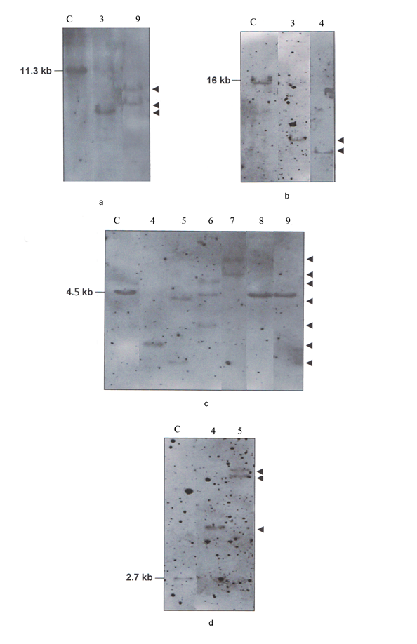 Figure 4 Southern Blot analysis of the IGK gene in B-CLL cases (samples 3, 4, 5, 6, 7, 8, 9). Hybridization of alkaline phosphatase Cκ probe to the BamHI digest (a). Hybridization of alkaline phosphatase Kde probe to the BamHI digest (b), BglII digest (c), HindIII digest (d). C: control DNA. The size of germline bands are given on the left and the assignment of the rearranged bands by an arrow on the right.