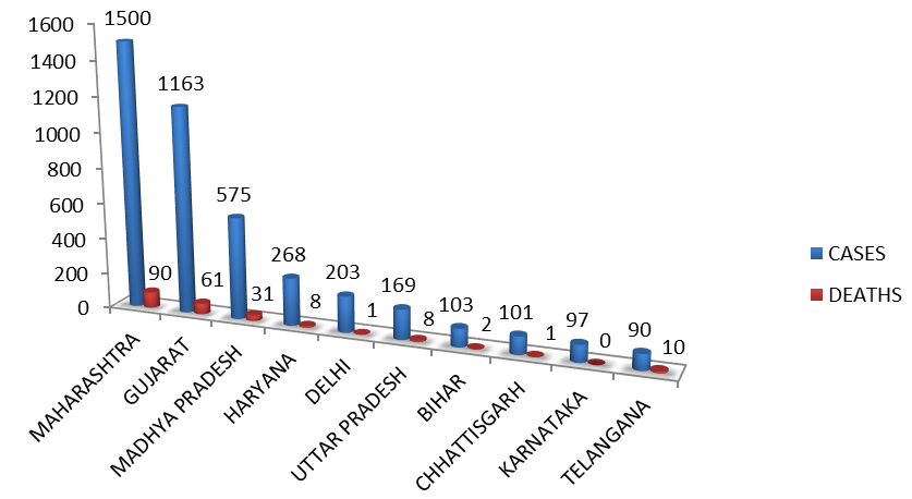 Maharashtra has 1,500 Mucormycosis cases and 90 fatalities as a result of the disease. In Gujarat, 1,163 instances of mucormycosis have been identified; with 61 deaths.While MadhyaPradesh has 575 instances of Mucormycosis and 31 fatalities. In Haryana 268 instances of Mucormycosis and eight deaths have been reported. Delhi has recorded 203 instances of Mucormycosis and one death. Uttar Pradesh has recorded 169 instances of Mucormycosis andeight fatalities. Bihar has 103 cases and 2 deaths. Chhattisgarh has 101 cases, and one person hasdied as a result of it.While 97 cases of Mucormycosis has been recorded in the southern state i.e., Karnataka and no deaths were reported, according to government statistics. As many as 90 instances of Mucormycosis have been identified in this state of Telangana, with 10 deaths being reported (Figure 1). Other states, like Rajasthan, Andhra Pradesh, and Uttarakhand, have shown a continuous increase in the number of Mucormycosis cases and deaths.4