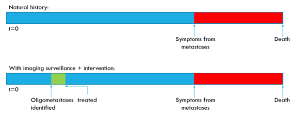 Figure 2 depicts the natural history of a cancer from time zero to death. With rigorous imaging surveillance, we identify oligometastases before they become symptomatic and we introduce the so-called lead time bias. Patients end up receiving therapy at an earlier stage of their disease evolution, potentially being exposed to treatment side effects. At the same time survival appears to increase, although in reality remains unchanged and the overall morbidity is lengthened. Nevertheless, we do not think that the results we observe in various series could be justified solely on the basis of lead time bias. Also, ≥ grade 3 treatment side effects of SABRT in experienced centers are particularly low.11