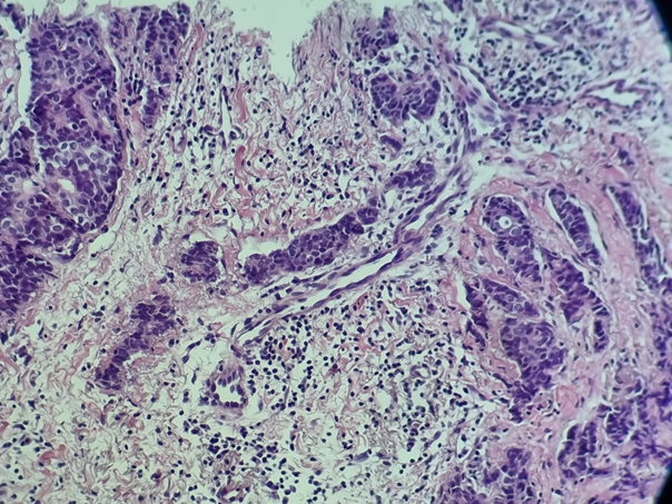 As part of the etiological diagnosis, the patient was referred to our medical oncology department at the Mohamed VI University Hospital. Our clinical examination found a two-centimeter nodule in the left breast that was mobile in relation to the two planes, and the echomammography showed a multifocal multicentric left breast with 5 nodules classified as Birads 5. The extension evaluation was mainly based on a thoracic-abdominal-pelvic scanner which did not reveal the presence of metastases. The histological diagnosis revealed the presence of a poorly differentiated infiltrating breast carcinoma (Figure 1), grade III SBR, with hormone receptors-positif , human epidermal growth factor receptor 2-negative (HR+/HER2−) and the Ki 67 is 30%.