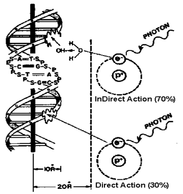 Direct: yielding energy to a biological macromolecule such as DNA, RNA, proteins, causing disruption of the molecules by breaking their bonds.