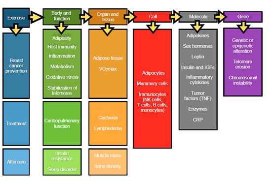 Breast cancer accounts for 75% of all cancers and 15% of cancer-specific deaths amongst females. However, death rates from breast cancer have been falling year by year, mainly due to new technology for early detection and therapeutic development. Physical exercise is beneficial to breast cancer patients through all stages (prevention, diagnosis, and survival) via immune response mechanisms, metabolism, hormone regulation, insulin resistance, anti-oxidant enzymes, and epigenetic regulation. Another hot topic is investigation of biomarkers, which plays an essential role in the management of patients with invasive breast cancer. Biomarkers and diagnostic tools, such as Kir67, urokinase plasminogen activator (uOA)-PAI-1, Oncotype DX, MammaOrint, EndoPredic, Breast Cancer Index (BCI) and Prosigna (PAM50) may be used to predict outcome and aid in adjunct therapy according to guidelines from the European Group on Tumor Markers.137,138 Frequent exercise not only stimulates or modifies changes in both genes and proteins that are biomarkers for diagnosis of breast cancer, but also reduces risk factors and is associated with successful treatment outcomes for breast cancer. Therefore, physical exercise is capable of bringing the benefits of both prevention and treatment in breast cancer, and increases the survival of breast cancer patients.