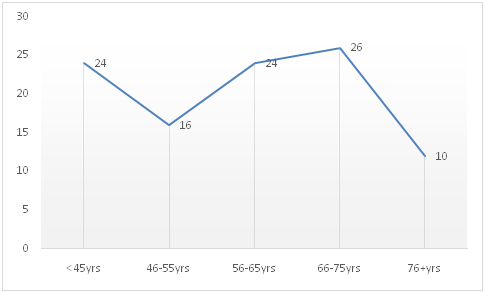 This study investigated 100 tissue samples which were obtained from Sudanese patients with esophageal carcinoma (90 patients were with squamous cell carcinoma and 10 were with adenocarcinoma). Of the 100 study subjects 54 were males and 45 were females their age ranging from 12 to 98 years old with a mean age of 60 years. The majority of the study populations were at the age range 66-75years constituting 26 patients followed by age ranges, both 56-65 and <45years representing 24 patients. Moreover, 16 patients were identified among age group 46-55years, hence only 10 patients were found among age group 76+years, as indicated in (Figure 1).