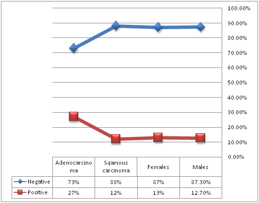 However, most of the patients were diagnosed as having Squamous cell carcinoma representing 90% followed by Adenocarcinoma representing 10%. Of the 90 patients with Squamous cell carcinoma, 52% were males and 48% were females. Of the 10 patients with Adenocarcinoma 73% were males and 27% were females.