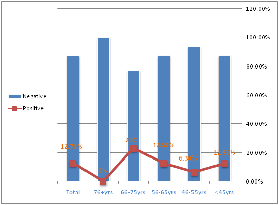 Concerning IHC staining results of HPV subtypes 16, 18 with age distribution, the highest positive results were found in age group 66-75 years, representing 6(23%), followed by (<45& 56-65) and 46-55 constituting 3(12.5%) and 1(6.3%) respectively, where's; the groups with the highest negative results were <45 and 56-65 years, representing 21(23.6%) in each followed by 66-75,46-55 and 76+ constituting 20 (22.5%), 15 (16.8%) and 12(13.5%) in this order, as shown in (Table 2) & (Figure 3).