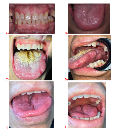 (A) Initial panoramic view in occlusion, (B) Initial tongue, (C) & (D) More acute stage of grade III mucositis with erbitux (cetuxumab) in the 17th radiotherapy session, with a larger area of involvement in the tongue, especially on the left lateral edge, so it is recommended to increase the use of Spirulina toothpaste, the use of Hydral® GUM® spray and gel and a soft diet, E; After 15 days, F; After 3 weeks