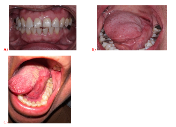 (A) Initial panoramic view in occlusion, (B) Initial tongue, (C) Presence of generalized grade III mucositis