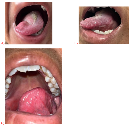 (A) Mucositis with the main lesions in the tongue, initial, (B) and (C) presence of mucositis