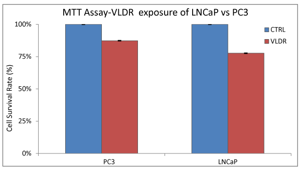 Treated cells showed dose-dependent degree of cellular cytotoxicity after 24hours incubation (Figure 3). Treated LNCaP cells were observed to be showing series of morphological features (Figure 3C and 3D), such as shrinkage of the cells, nuclear and cytoplasmic condensations, and fragmentation into membrane-bound apoptotic bodies, which are typical hallmarks of apoptotic cell death. Micrograph (Figure 3D) demonstrated that as predicted, a higher percentage of LNCaP cells were undergoing cell death via apoptosis when both treatment modalities were combined compared to when a single treatment with VLDR (Figure 3C) was instituted.