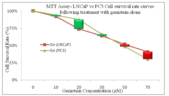 Briefly, LNCaP and PC3 cells were plated onto 96 well plate each at a density of 1×104 cells per well. They were primed with single doses of 20mGy/hour ionizing radiation (VLDR) from a pyroelectric X-ray generator and then incubated with graded doses of Genistein (Gn0-70) for 24hours. Cells were treated with Genistein, 4hours after irradiation for most experiments. 100µL of MTT (2.5 mg/ml in PBS-phosphate buffered saline) (Sigma Scientific Chemical Co., St Louis, MO, USA) solution was added to each well and incubated for 4hours at 37°C and 5% CO2 to allow for the reduction of MTT into formazan by viable cells. The insoluble formazan crystals formed were solubilized or lysed to release the formazan product by adding 100μL of lysing solution (DMSO) to each pellet. Cells from each well were harvested (by vigorous aspiration with the micropipette), transferred to a labeled micro centrifuge tube and centrifuged for 10minutes at 5000rpm. Any unincorporated MTT dye was removed by discarding the supernatant. The contents of each tube were transferred into different wells of a 96-well micro titer plate. The absorbance values were measured at 490nm with an automated micro plate reader (BioTek, Vermont, USA). The relative population of live cells could therefore be determined based on the optical absorbance (optical density, OD) of the sample. The values of the blank wells were subtracted from each well of treated and control cells; and the mean percentage of post-treatment viable cells relative to the controls was calculated as shown: