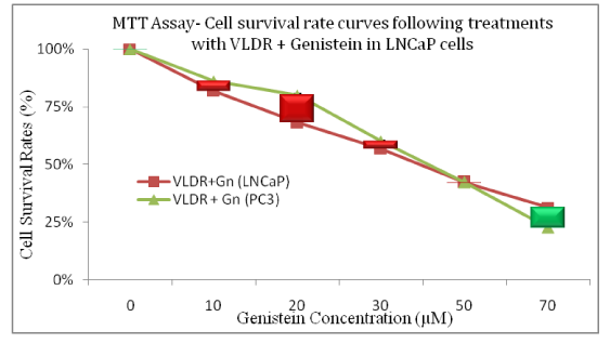 To determine the anti-proliferative or growth inhibitory effects of VLDR and/or Genistein treatments on each prostate cancer cell line, MTT assay was used. MTT (3-4, 5-dimethylthiazolyl-2-2, 5-diphenyltetrazolium bromide) is a tetrazolium dye used to determine percentage cell survival rate (% CSR) or differential growth inhibition rate (DGIR), which is equivalent to HRS in this study. The MTT dye detects metabolic activity through preferential conversion of viable cells into purple colored formazan. The enzyme mitochondria dehydrogenase is only present in the active mitochondria of living cells, and is responsible for cleaving the tetrazolium substrate into insoluble formazan. The color intensity generated is directly proportional to the number of viable (metabolically active cells) and quantitatively determined by optical absorbance from individual wells.