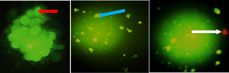 Acridine orange/Ethidium bromide fluorescence assay: The Acridine orange/Ethidium bromide fluorescence assay was used to differentiate between viable, apoptotic and necrotic cells. The two dyes function simultaneously to emit different fluorescent spectra. Acridine orange permeates both viable and non-viable cells, causing the nuclei to emit green fluorescence. The assay becomes differential with the use of Ethidium bromide, since absorption is based on the lack of cell membrane integrity; thus it selectively stains the nuclei of dead (non-viable) cells to produce red fluorescence. Cells that emit orange/brown colored fluorescence are indicative of apoptosis, while necrotic cells emit red fluorescence.