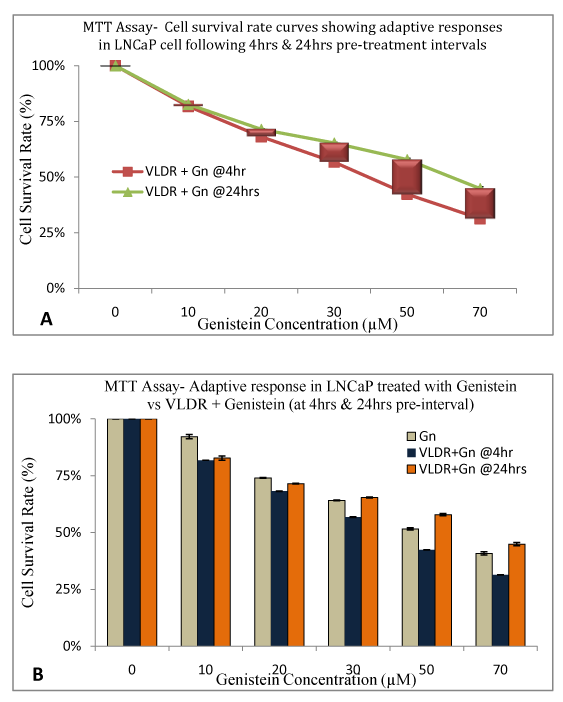 To test for treatment-induced adaptive response in LNCaP cells; the same procedure was followed as described above, but in this experiment, intervals of 4hours and 24hours were created between exposure to VLDR and treatment with graded concentrations or doses of Genistein (Gn0-70) and thereafter incubated for 24hours at 37°C and 5% CO2. The percentage cell survival rates (% CSRs) were calculated relative to the controls to determine the HRS, which was each (y-axis) plotted against the graded concentrations of the drug (along x-axis).