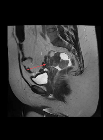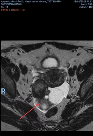 A 50-year-old female patient, asymptomatic, in a routine gynecological medical consultation, was requested to perform a transvaginal ultrasonography, which revealed an enlarged right ovary, showing regular contours and heterogeneous echotexture due to the presence of a nodular, heterogeneous, predominantly echogenic image, with areas of posterior acoustic shadow measuring approximately 3.2 x 3.1 cm. Dermoid cyst was questioned by the ultrasonographer and recommended further investigation with MRI. The patient underwent the suggested examination within a few days and the right ovary was found to be enlarged, displaced posteriorly, measuring approximately 7 x 5.6 x 2.8 cm, associated with the presence of simple cystic formations measuring up to 3.2 cm and one with thick content measuring 2.1 cm (Figure 1 and 2). It is also noted the presence of two hypovascular nodular formations in between, with heterogeneous signal, in close proximity to the serosa of the right lateral uterine body wall, measuring 4.5 x 3.1 cm.