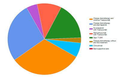 Our results present this controversy in defining whether CNS failure represents failure on Trastuzumab or no, and what the best treatment option to start with. Although changing chemotherapy and start with Lapatinib was the first choice, but the difference between this choice and continuation on Trastuzumab was not big. On the other hand, failure on Trastuzumab in the form of visceral metastasis, other than CNS, showed more controversy, as the decision was almost equal between these two options.
