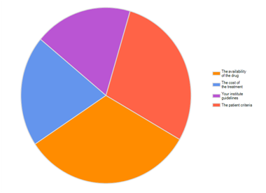 Regarding the third point of interest in our survey, which is the main factor affecting treatment decision? 32.3% stated that the availability of the drug is the main factor, while 28.7% had chosen the patient criteria as the main factor. 20.4% saw that the cost of the treatment is the main factor affecting their decision making while 18.6% had chosen the institute guidelines as the main factor (Figure 6).